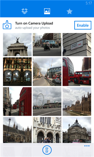 Applikationen byder på flere kernefunktioner til Dropbox-tjenesten som eksempelvis mulighed for at bruge Phone eller en tablet til automatisk sikkerhedskopier af billeder via kamerafunktionen.