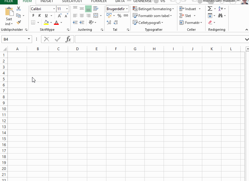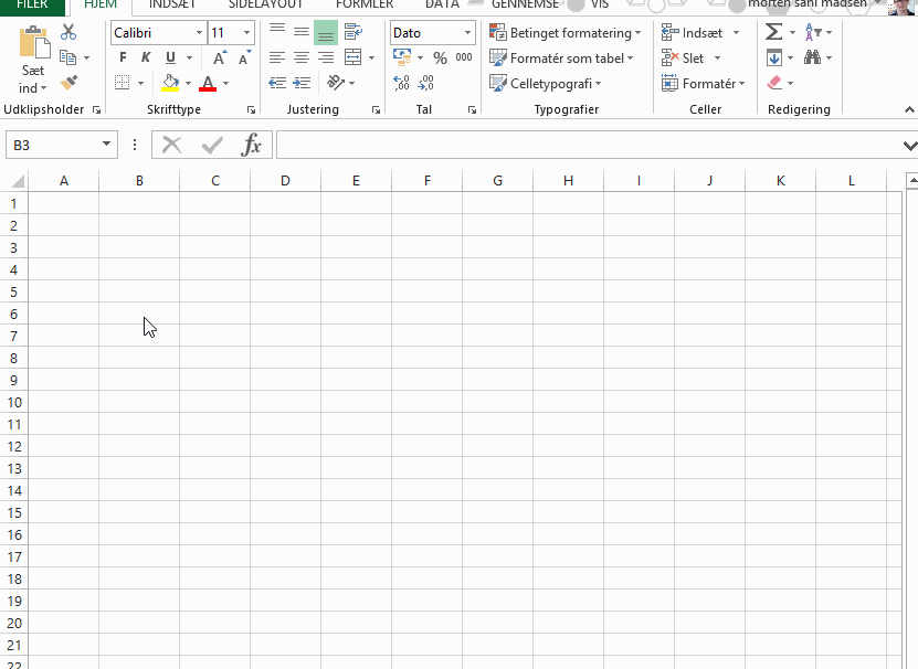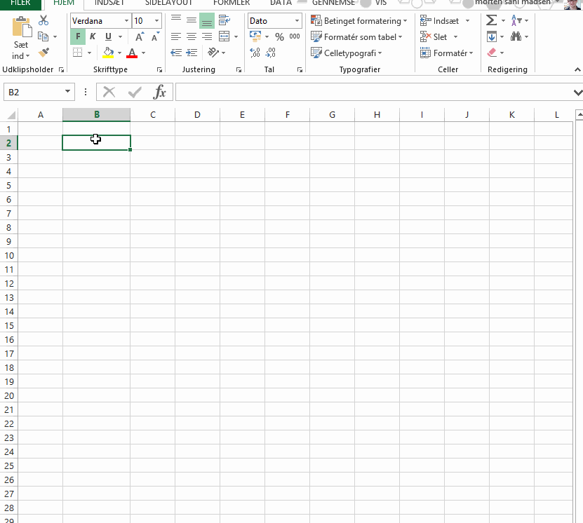 I stedet for at skrive januar, februar, marts og så videre i hver sin celle, så skriv januar i den første, og tag derefter fat i plustegnet i hjørnet og træk. Du kan nu se, at Excel selv skriver de efterfølgende måneder, og kommer du til december, så starter den bare forfra.