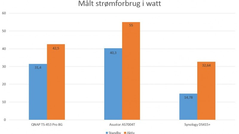 Samtidig er det målte strømforbrug knap 15 watt, når harddiskene går i standby, og knap 33 watt, når du overfører data fra eller til drevet.