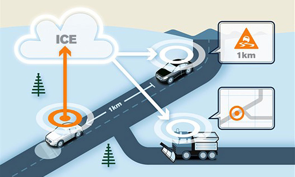 Teknologien testes i øjeblikket i både Sverige og Norge i et pilotprojekt med 1.000 biler, der deler data om med hinanden og med vejmyndighederne.