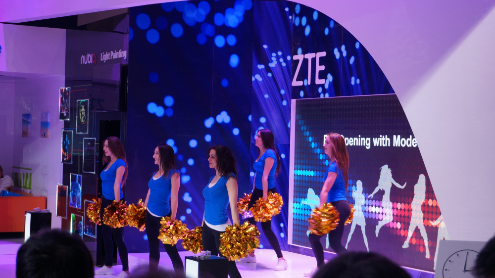 Bag Huawei-standen står kinesiske ZTE med en lige så stor stand. Ofte glemmer vi vesterlændinge, hvor store de kinesiske firmaer er. Tre boothbabes iklædt cheerleadertøj danser rundt mellem en tilskuerskare, som øges jo længere tid, pigerne danser.