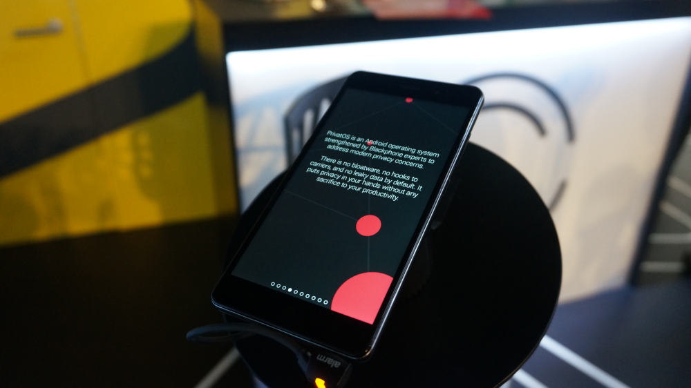 Det aflukkede område med det mørke tema passer perfekt til standejerne, som i sorte jakkesæt fremviser en lige så sort telefon. Blackphone 2.