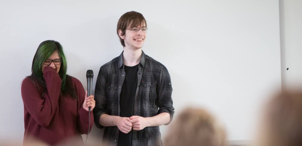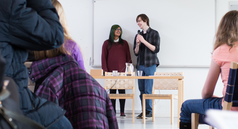 Ordene kommer fra Robin, den ene del duoen, som genert vrider sig oppe foran hele salen på Vigerslev Bibliotek en lørdag i marts.