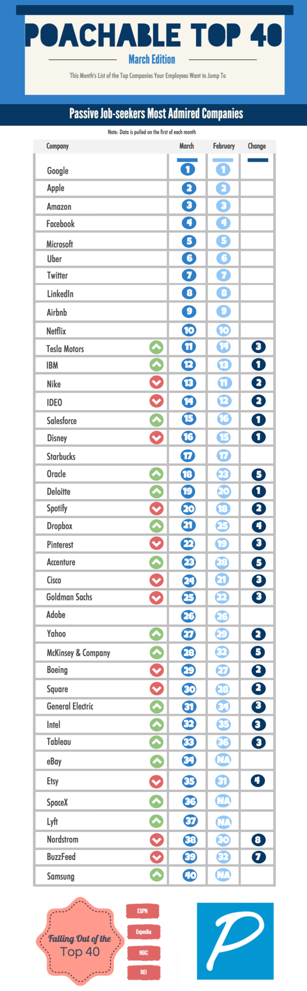 Samtidig laver har Poachable også hver måned en generel liste over, hvilke virksomheder de passivt jobsøgende helst vil arbejde for, hvis de skulle skifte job.