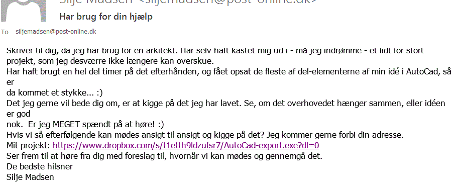 Den uønskede e-mail leveres på perfekt dansk og med et link til Dropbox.