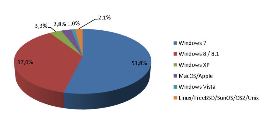 Hvis man starter med at se på, hvilken software-platform, undersøgelsens computere er bygget op omkring, er Microsoft dominerende med Windows 7 i spidsen og Windows 8(.1) som nummer to.