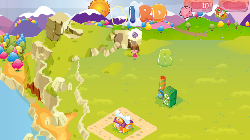 Et grønt og dejligt område henstår ubebygget og klar til aktivitet. Tre træer ses i området mens et tyggegummi-lignende A svæver omkring - der er brug for en sav for at komme videre, og den kommer først til syne, når bogstavet A med en finger trækkes på plads i ordet SAV.