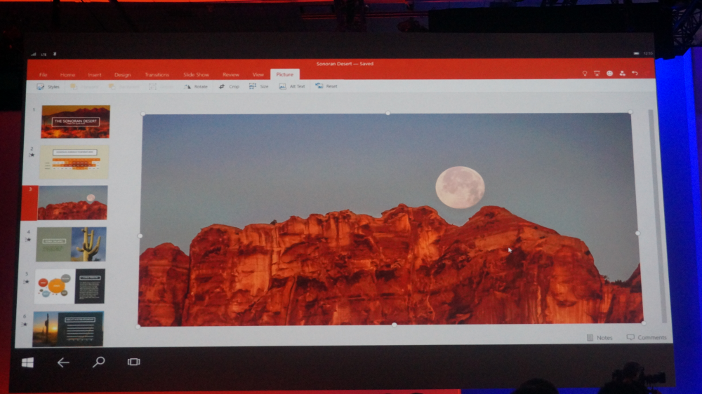 Med en startmenu i den ene side kunne Joe Belfiore åbne Microsoft Word, hvilket åbnede op på skærmen, som var det på en stationær computer. For den kommende version af Word er en Universal App, så den tilpasser sig, hvilken skærm den benyttes på.