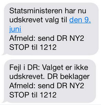Ifølge DR-SMS'en skulle der være valg i Danmark den 9. juni - men det var altså kun CMS'et, der udskrev det valg, da Helle Thorning-Schmidt endnu ikke har selv meddelt den konkrete dato.