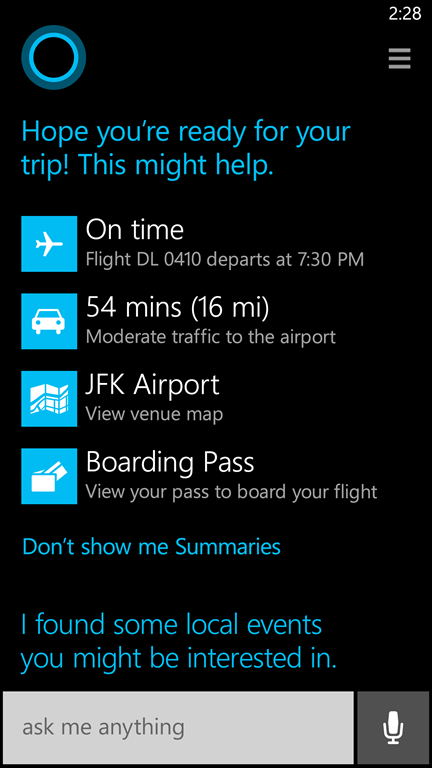 Cortana er en digital assistent, som du både kan skrive og tale til og som kan udføre opgaver for dig såsom at skrive en besked igennem en specifik app, lave en kalenderaftale med tilknyttet note, eller finde forskellige opskrifter på ragout.