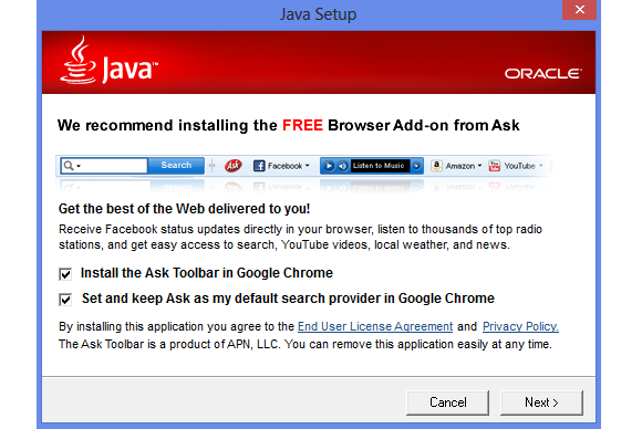 "We recommend installing the FREE Browser Add-on from Ask" - står der, når du installerer Java fra Oracle. Og så er der allerede hakket af i feltet for dig.