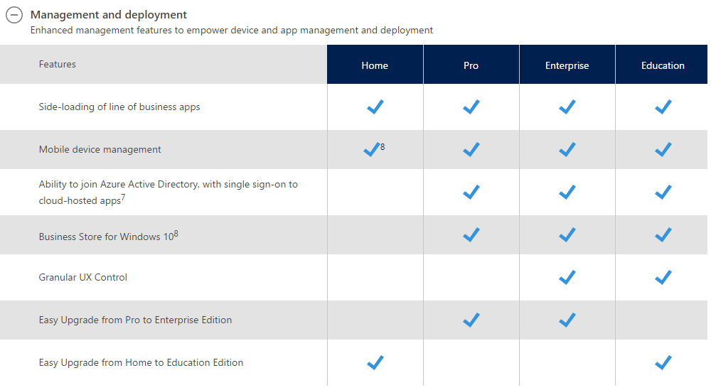 De store forskelle ligger naturligt under "Business Experiences", hvor der begynder at være betydeligt flere flueben ved Enterprise og Education-versionerne.