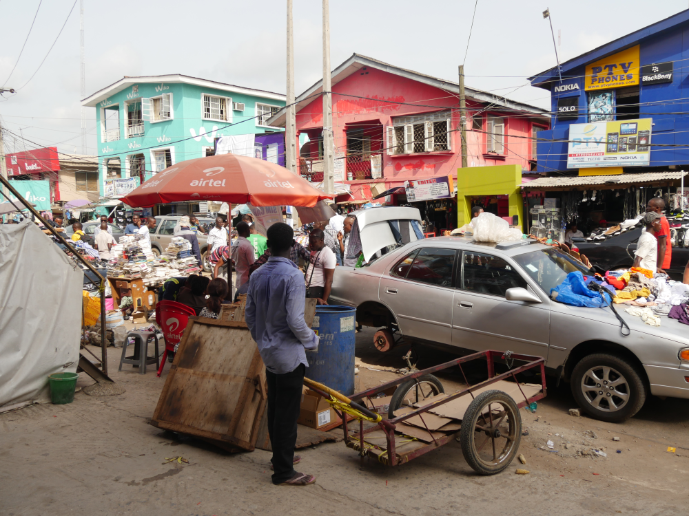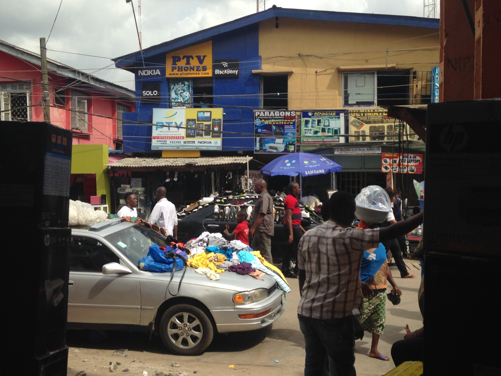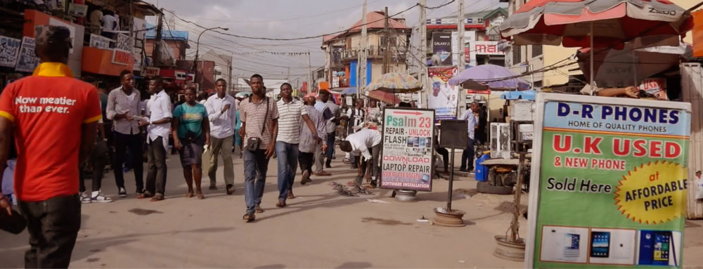 Ability Abiodun ejer en butik i en smal, mørk sidegade, hvor en række unge nigerianere sidder og lodder gamle Blackberry-telefoner sammen. Han står i tætsluttende jakke og slips, mens hans kone giver deres barn bryst bagest i buttikken.