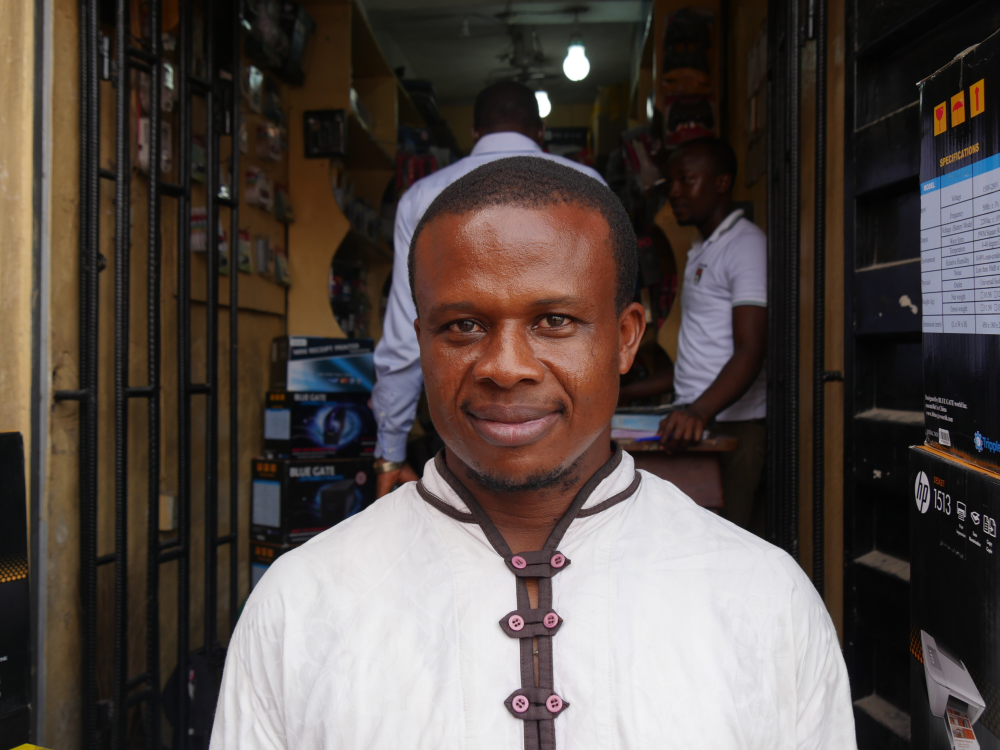Før han flyttede til millionbyen Lagos boede han på landet uden elektricitet. Men i 12 år har han drevet en butik på størrelse med to prøverum. Herfra sælger han harddiske og printere, men også backup-batterier, der er særligt nyttige i et land som Nigeria, hvor strømafbrydelser sker flere gange om dagen.
