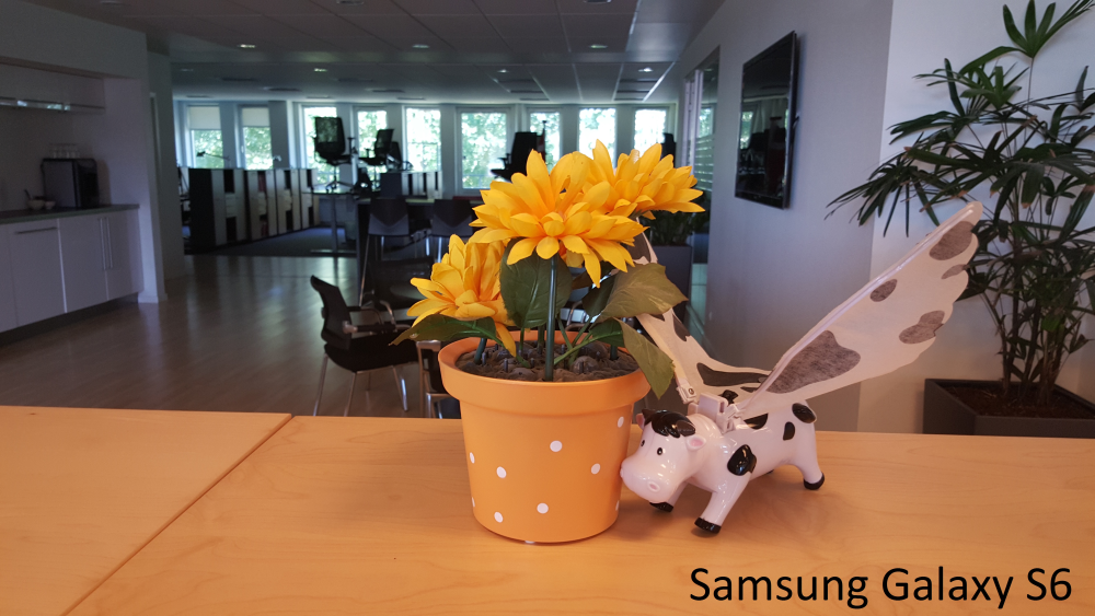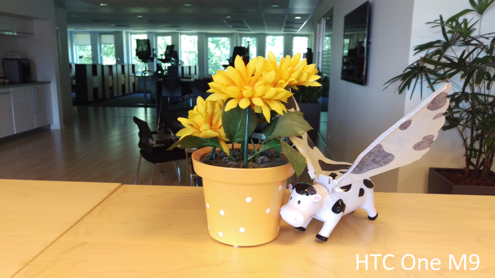 Først har vi taget et billede inde på vores kontor med en kunstig blomt i skarpe farver samt en flyvende ko. Lyset er klassisk gulligt "kontorlys", hvilket er meget sigende for mange steder indendørs.