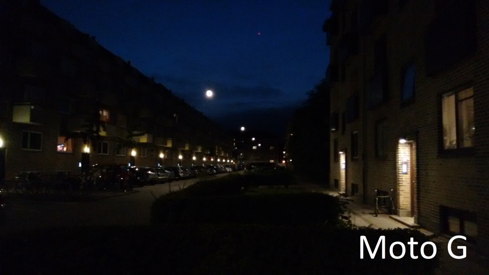 For selvom at der ikke er særlig mange megapixel at lege med, så er kameraet et lille mester i at fange lys, så selvom at der er så mørkt, at Moto G's billede næsten ikke kan bruges til noget, så kan du fint se omgivelserne på iPhone-kameraet.