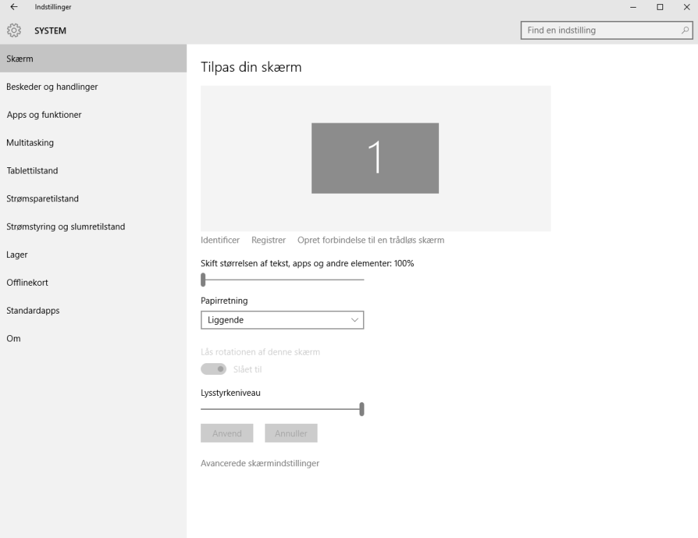 Vi har det på 100 procent og ikke 150 procent, som Microsoft ellers gerne vil have det til at være. Har du en computer med en meget høj opløsning, så kan det måske give mening at sætte den på 150 eller 125 procent.