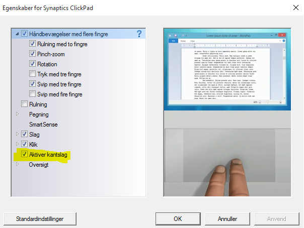Gå ind under "Indstillinger", "Mus", "avancerede museindstillinger" og tryk "ClickPad-indstillinger" i det sidste vindue.