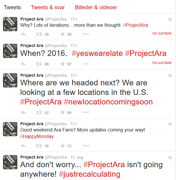 I et par spartanske tweets har holdet bag Projekt Ara forklaret interesserede, at der inden for kort tid vil komme nyt om Project Ara men, at vi ikke skal forvente at se telefonerne for alvor før 2016. Project Ara's Twitter-account tilføjer tweets'ne med et #WeKnowWeAreLate.