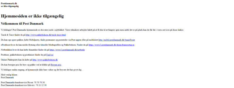 Postdanmark.dk er mandag blevet afløst af en hvid side med en besked om, at hjemmesiden ikke er tilgængelig, ligesom der er links til flere af Post Danmarks onlinefunktioner.