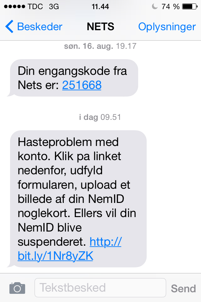 I sms'en bliver brugeren bedt om at klikke på et link til en hjemmeside, hvorfra man skal sende et foto af sit NemID-nøglekort.