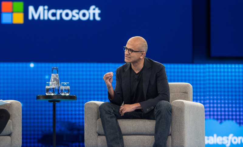 Satya Nadella, CEO hos Microsoft, fra scenen til Salesforce store Dreamforce-konference i San Francisco.