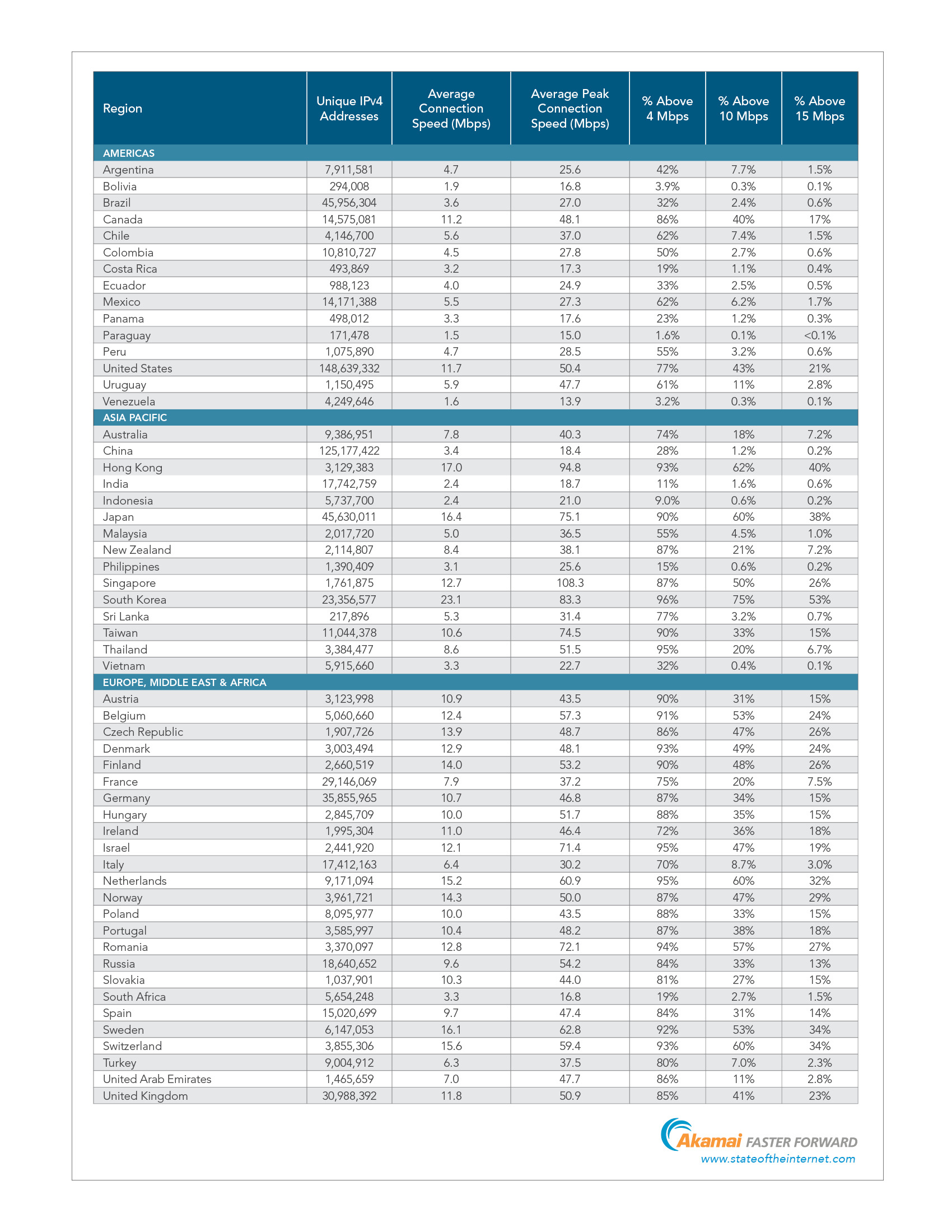 Hvert kvartal udarbejder firmaet Akamai en rapport, der hedder "State of the Internet", som blandt andet måler på gennemsnits- og tophastigheder i en stribe af verdens lande.