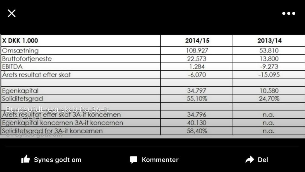 "Vi er naturligvis stolte af at kunne aflægge ovenstående regnskab, der med markante resultatforbedringer over hele linjen også viser kunder og partnere, at vi udover viljen og lysten til fortsat at investere i virksomheden, også har råd til det," hedder det i Facebook-opslaget, hvor 3A-it også konstaterer, at firmaets økonomi er "bundsolid".