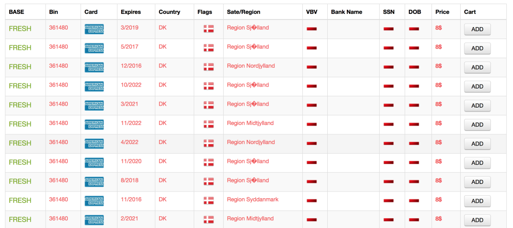 Andre steder kan du købe 'friske' American Express-kortdata fra Danmark for godt 50 kroner, som er blevet hugget inden for et døgns tid eller to. Her er det ikke selve kortet, der er stjålet, men derimod de data, som er tilknyttet til et kortet, som man køber.