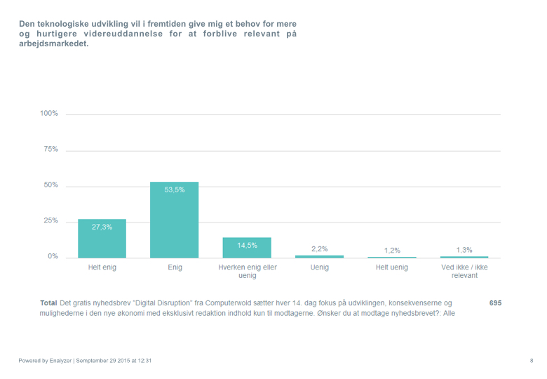 I undersøgelsen, der er besvaret af 695 læsere, svarer 64,2 procent, at de er enige eller helt enige i, at deres erfaring og evner ruster dem endnu bedre til fremtidens arbejdsmarked, der vil være præget af en hurtig teknologisk udvikling.