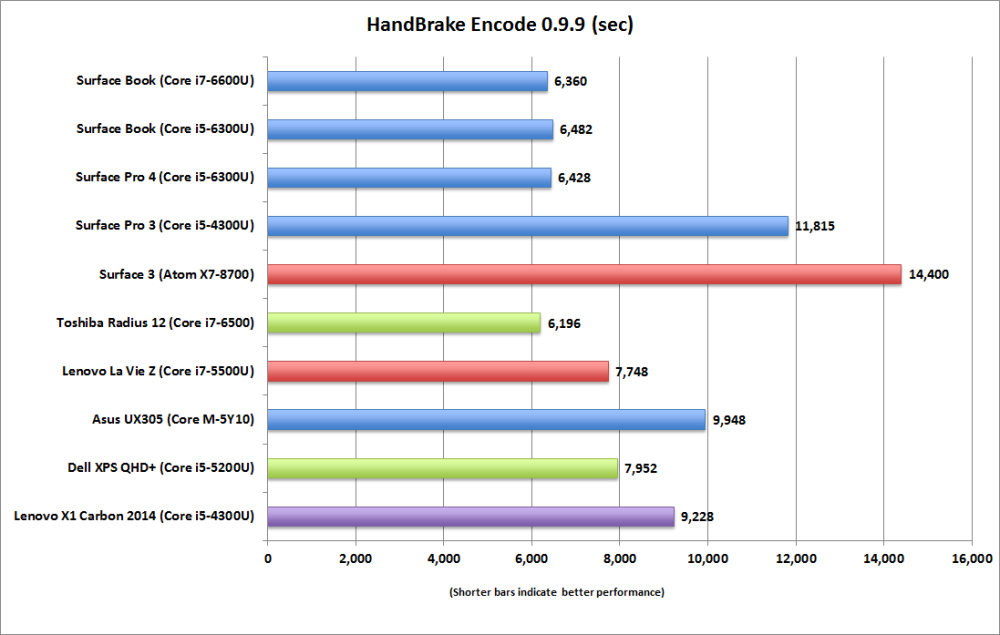 Blandt andet har Pcworld.com testet encoding af video. Forskellen mellem en Macbook Pro 13 og en Surface Book var her på 50 procent - igen til fordel for Surface Book.