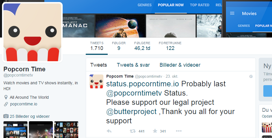 Oplysningerne bygger på et Twitter-indlæg fra en Popcorn-udvikler, der skriver, at det højst sandsynlig er det sidste indlæg på Popcorntimetv. Han takker for supporten.