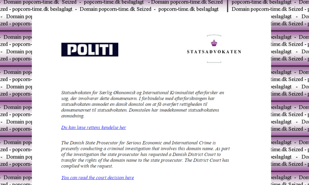 Går du til popcorntime.dk finder du eksempelvis en lukket webside, med en besked om at "Statsadvokaten for Særlig Økonomisk og International Kriminalitet efterforsker en sag, der involverer dette domænenavn."
