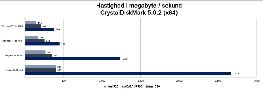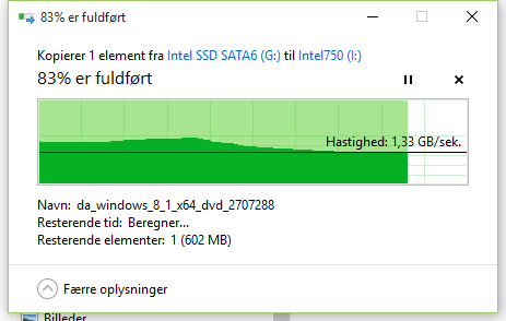 Lå test-filen på en ældre ADATA SSD tog opgaven fire minutter og 36 sekunder - og lå filen på Intels 750-drev, så tog opgaven fire minutter og 31 sekunder. Det samme var i øvrigt tilfældet hvis filen skulle skrives til drevet: fire minutter og 39 sekunder med ADATA og fire minutter og 35 sekunder med Intels SSD.