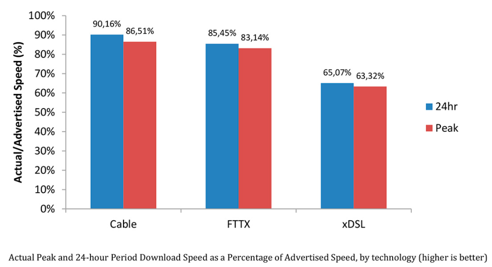 "Til trods for fortsatte investeringer i bredbåndsnetværk, hvilket øgede den gennemsnitlige reelle download-hastighed signifikant fra 30 Mbps i 2013 ttil 38 Mbps i 2014, forbliver forskellen mellem den markedsførte og den reelle hastighed konstant," står der i EU-rapporten.