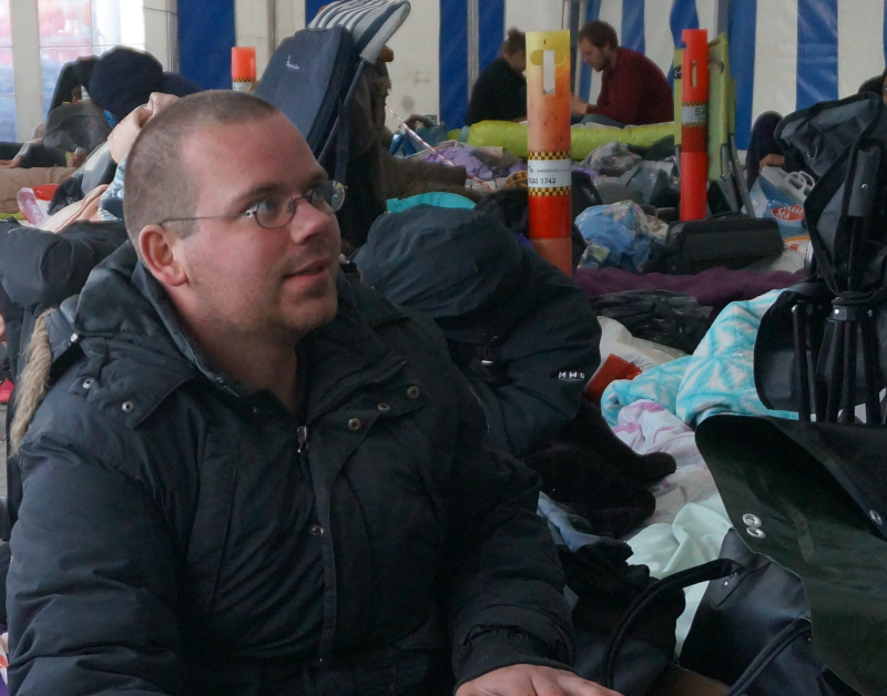 Han frøs hele tirsdag nat, fordi han ikke har et liggeunderlag med, men nu har nogle af de andre i køen fundet nogle papkasser, som han kan bruge som underlag.