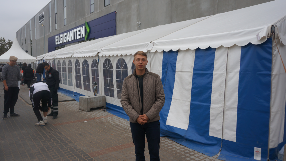 Elgiganten satte egentlig en varmekanon op i teltet allerede tirsdag, men den gik i stykker, og efter en nat med minusgrader er Philip Damgaard Olsen meget opmærksom på at holde varmen.