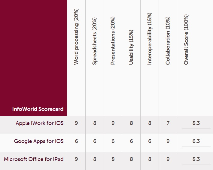 Infoworld tildeler både Apple iWork og Microsoft Office til iOS en samlet karakter på 8,3.