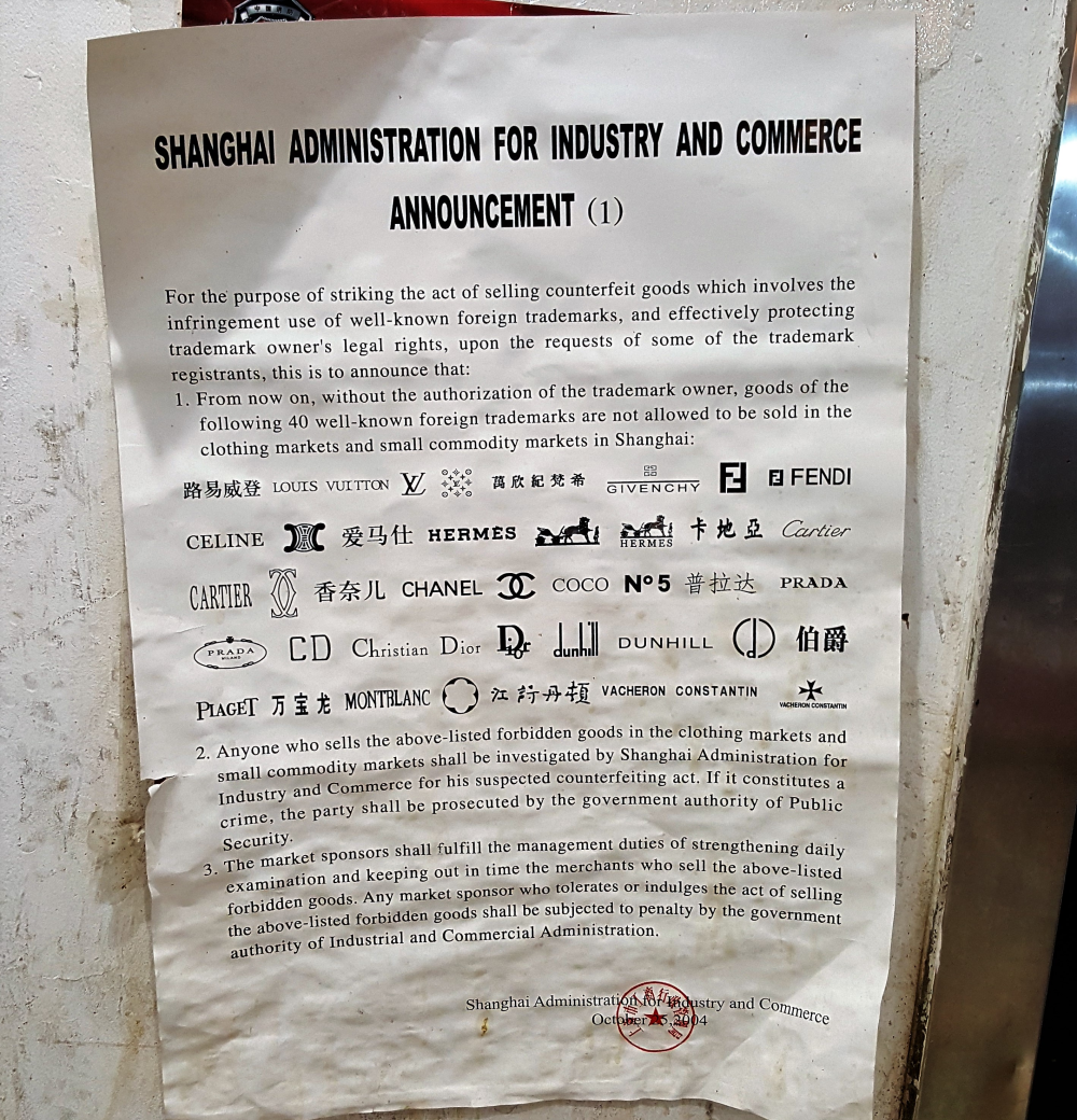 En seddel hænger skjult og iturevet i et hjørne af centret. Her har Shanghais politi erklæret i samarbejde med centerbestyrelsen, at cirka 40 forskellige mærker ikke må føres på markedet. Det indebærer Gucci, Louis Vuitton, Chanel og Prada.
