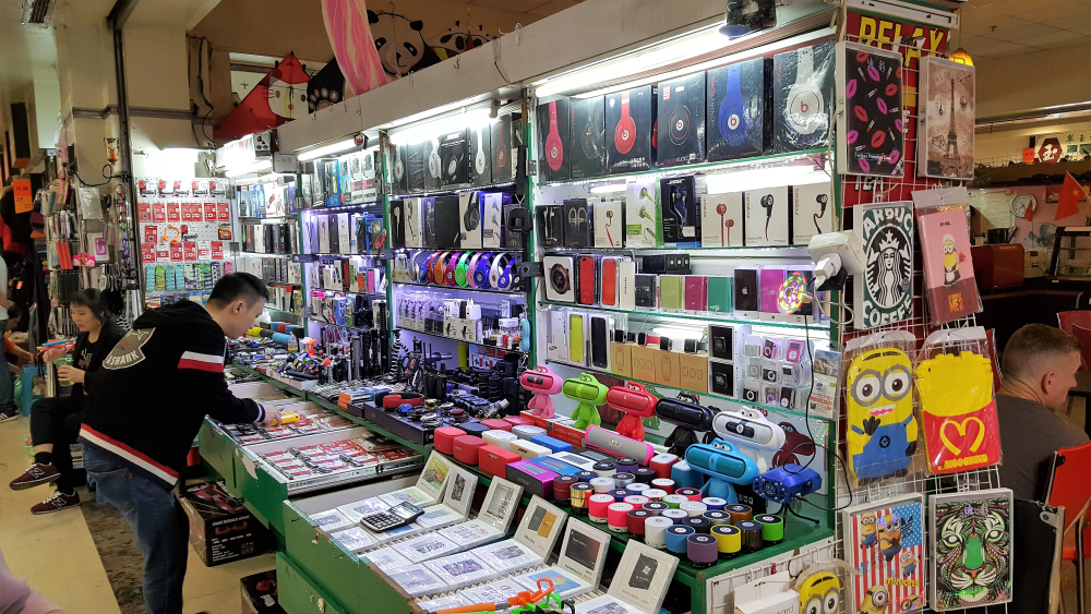 Inden for er der er en letgenkendelig duft af ny plastik. Den duft finder du også i en Fona eller i Elgigantens computerafdeling. Markedet består af et utal af små tre-kvadratmeterbutikker, som er et fint miks mellem tøj, tasker, slips, briller, og elektronik.