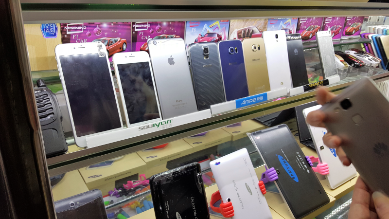 I butikken ved siden af os sælges der smartphones. På en lang række står der en iPhone 6, Samsung S6, et par Huawei-telefoner, og et par produkter, som formodentligt er kinesiske mærker.