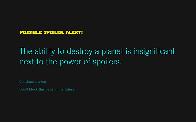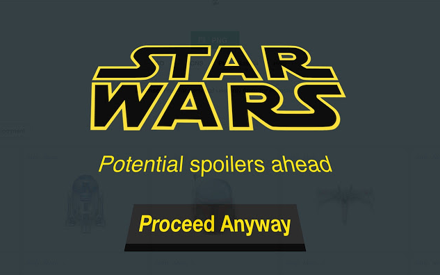 Du kan for eksempel hente den ganske logisk navngivne Star Wars Spoiler Blocker app til Google Chrome, som dækker en hjemmeside med en halvgennemsigtig advarselsskærm, hvis der er registreret spoilers på siden.