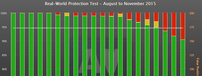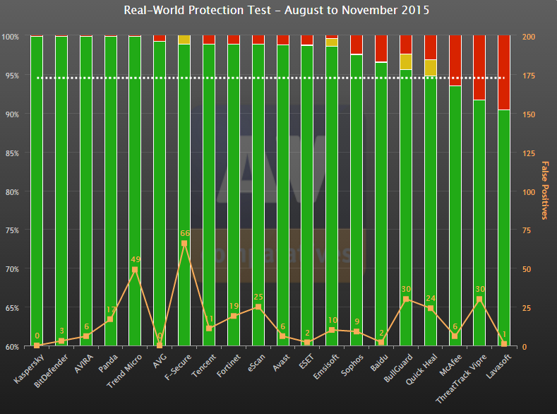 Den nederste gule linje er antallet af falske positiver i de forskellige programmer, hvor specielt F-Secure og Trend Micro skiller sig ud.