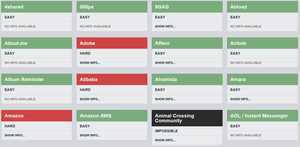 Justdelete.me er en stor oversigt over sites, som viser dig fire kategorier: "nem", "medium", "svær" eller "umulig" alt efter, hvor svært det er at slette en brugerkonto.