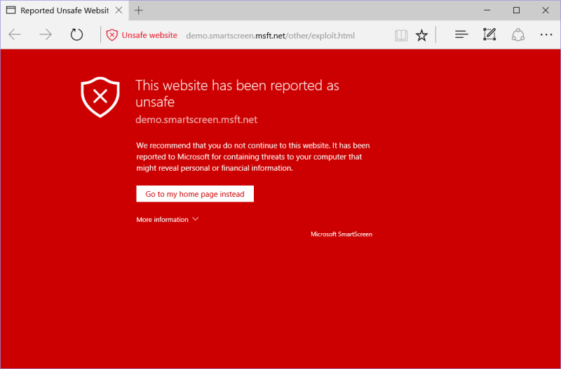 "Hvis SmartScreen ser, at en webside potentielt er ondsindet, vil du se en rød advarsel (se topbilledet, red.), og indholdet vil ikke blive indlæst i hverken Microsoft Edge eller Internet Explorer 11 på Windows 10."