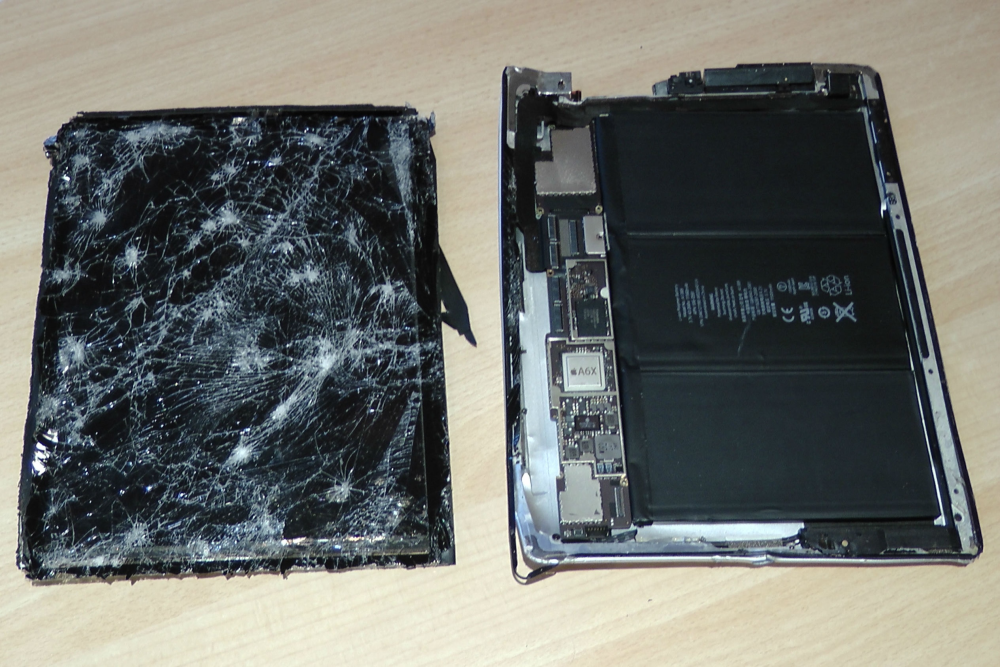 iPad'en var totalt smadret, og selve elektronikken var så beskadiget, at iPad'en genstartede sig selv hvert andet minut.