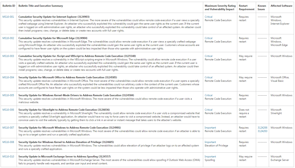 Der bliver således lukket huller i Windows, Edge, Internet Explorer, Exchange Server. Office-pakken, Silverlight og Visual Basic.