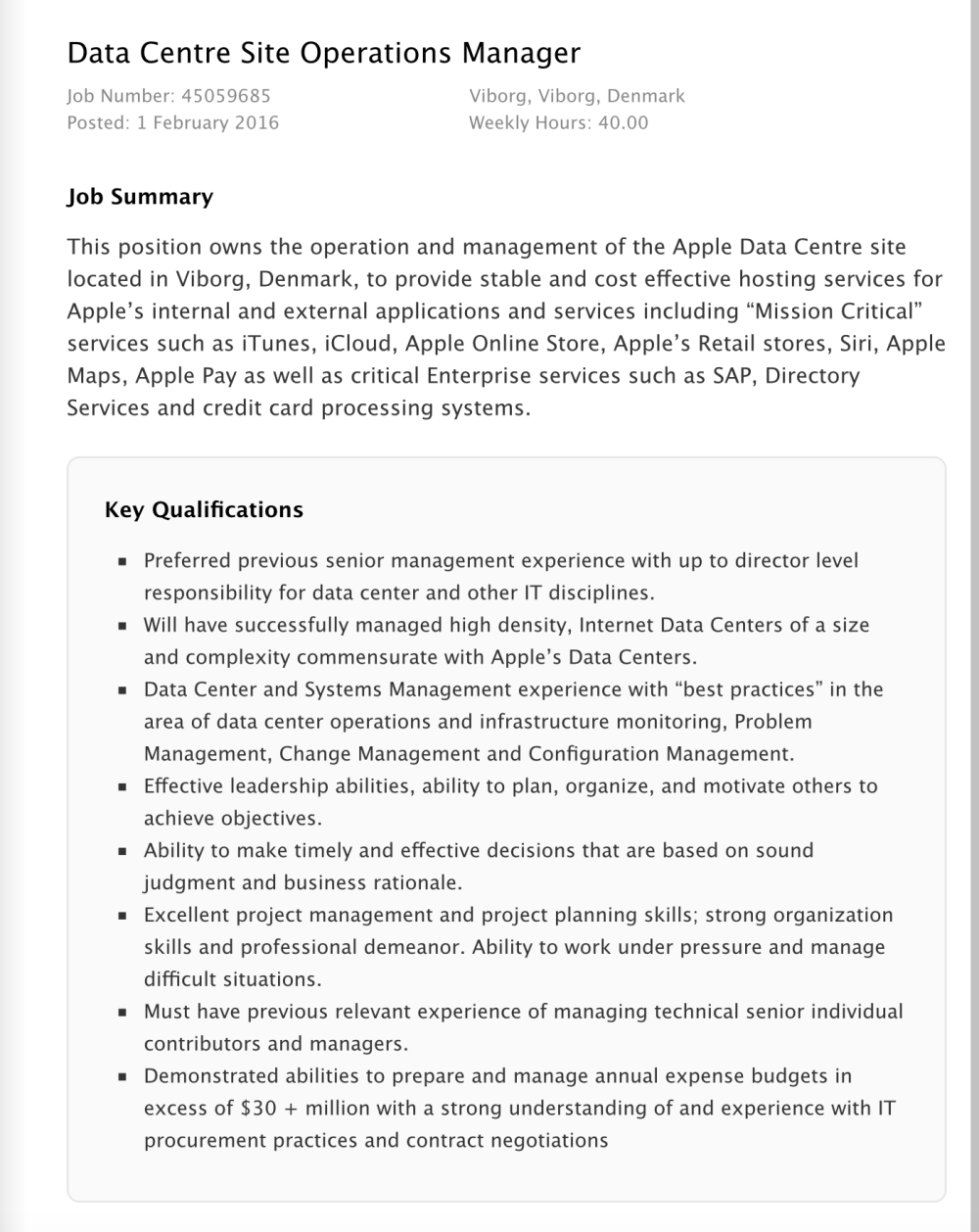I et jobopslag med overskriften 'Data centre site operations manager', som for nylig er blevet slået op på Apple.com, fremgår det, at du som chef for datacenteret i Viborg i første omgang vil blive en del af det team, der har ansvaret for konstruktionen af datacenteret.