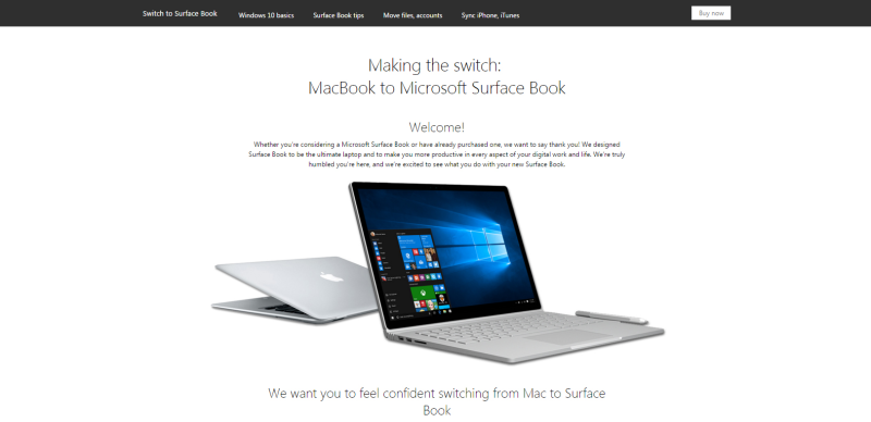 "Vi ønsker at gøre skiftet så let som muligt. Hvis du i øjeblikket har en Mac og har spørgsmål om at skifte til Microsoft Surface Book og Windows 10, har vi designet denne side til at hjælpe dig med at komme i gang."