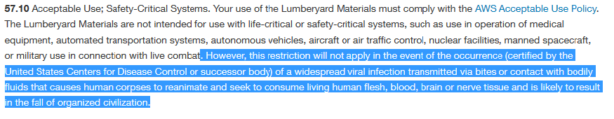 "Denne begrænsning gælder ikke i tilfælde af... ...udbredt viral infektion, der smitter via bid eller kontakt med kropsvæsker, som får menneskelig til at genopstå og forsøge at fortære levende menneskekød, blod, hjerne eller nervevæv, og som sandsynligvis vil føre til civilisationens fald."